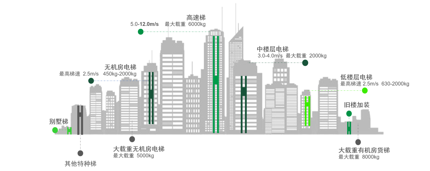 Мы предлагаем широкий ассортимент тяговых машин и соответствующих базовых рам, подходящих для сценариев применения с максимальной грузоподъемностью 6000 кг (соотношение 2:1) и максимальной скоростью 12 м/с (соотношение 1:1). Клиенты могут напрямую выбирать подходящие модели на основе параметров лифта, что значительно сокращает цикл проектирования.