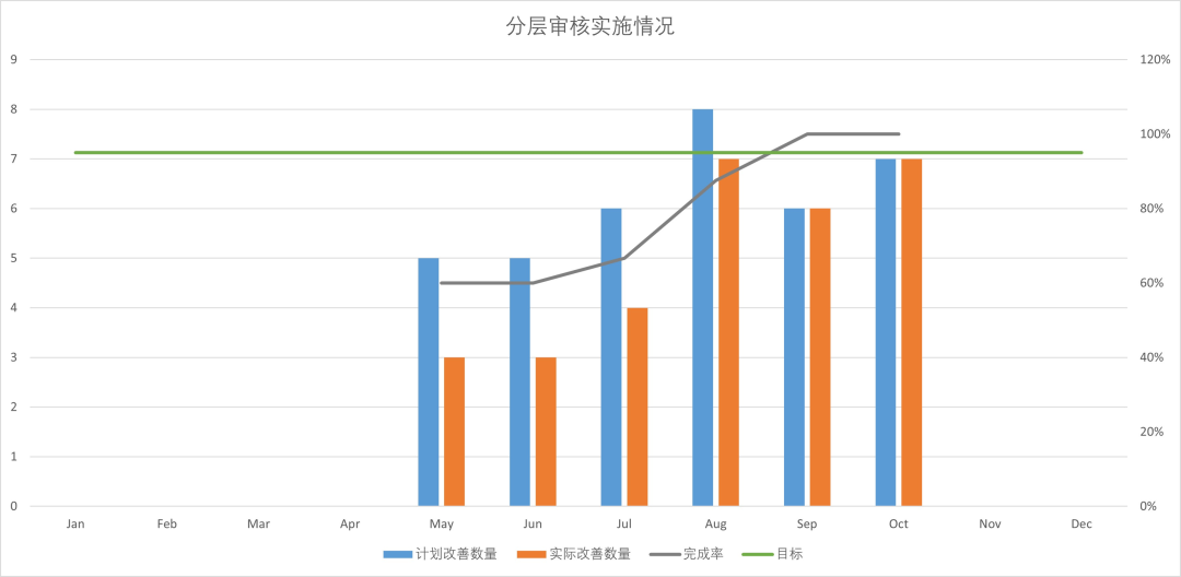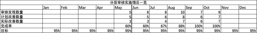 Содержание многоуровневого аудита процесса обширно. Чтобы контролировать эффективность и качество аудитов, фактическая реализация LPA отображается таким же образом, как и на панель панели. Отображаемый контент включает в себя: скорость завершения реализации, количество выводов аудита, скорость завершения улучшений и т. Д.
