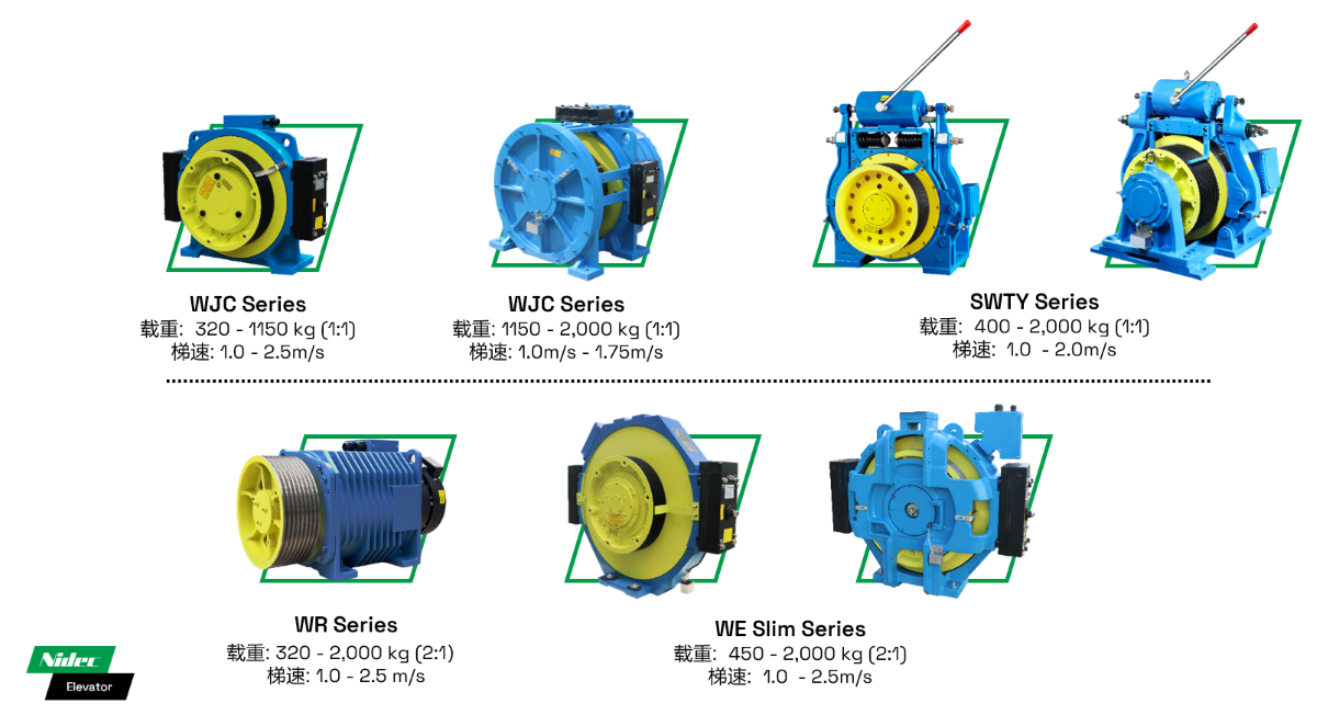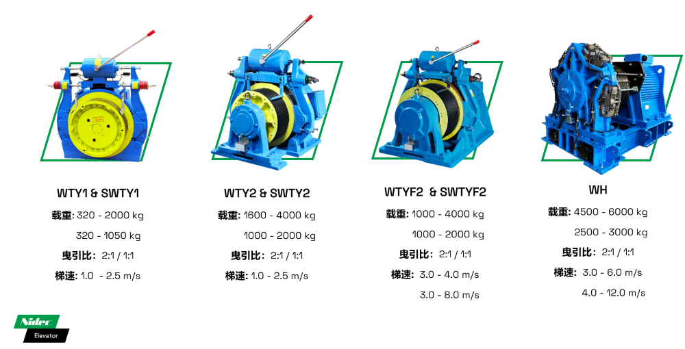 • При максимальной грузоподъемности до 5500 кг и максимальной скорости лифта 3 м/с различные схемы коэффициента тяги охватывают требования к нагрузке в диапазоне от 2500 до 5500 кг.