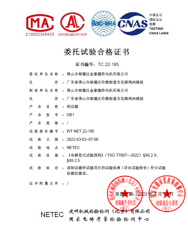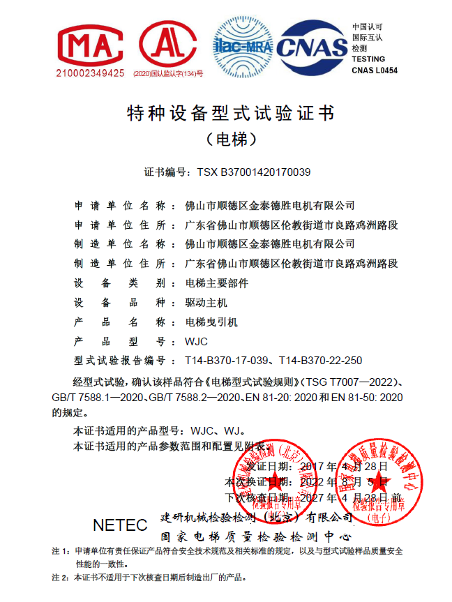 1. Сертификация тестирования типа специального оборудования в Китае: включая основной тест типа двигателя, защиту от чрезмерного скорости автомобиля и сертификация устройства для защиты от непреднамеренного движения, охватывающая сертификацию всех рядов наших основных двигателей. В то же время, он также может предоставить услуги по вспомогательной поддержке быстрого сертификации для полных клиентов лифта.