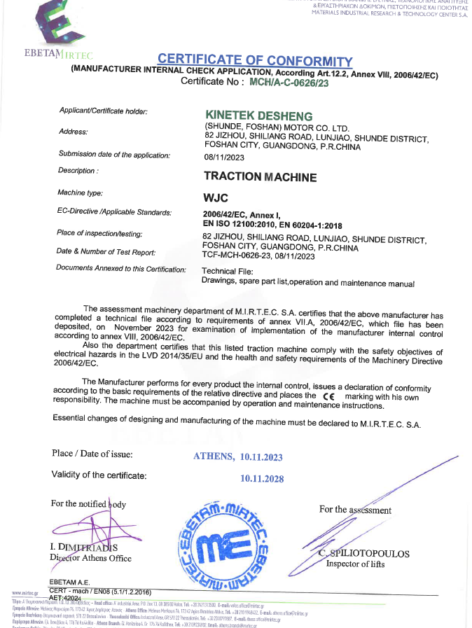 4. Сертификация EU CE (сертификация CE для механической директивы двигателей и сертификации EN81 для тормозов): охватывает все серии наших моделей, таких как WJC/WTY1/WR/WTY2.